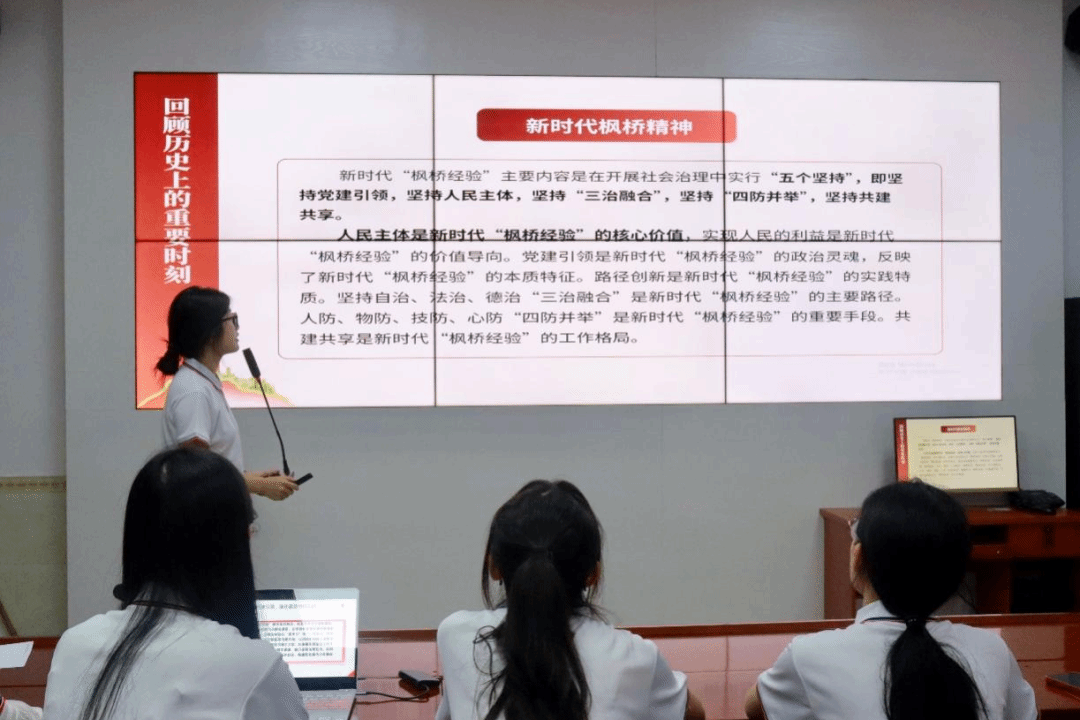 7月8日下午,实践团组织策划了大中小学生破冰互动环节,通过“乒乓球接力赛”“桃花朵朵开”“正话反做”等系列活动,拉进青髫志愿者与实践团成员之间的距离。紧接着,实践团开展枫桥社区发展沿革及治理经验学习交流会。会上,实践团成员各抒己见,讨论热烈,并合理利用多媒体设备展示学习成果,在交流互鉴中深入了解枫桥为民、利民、惠民的实践做法。