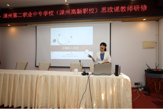 漳州职业技术学院张毓雯老师带来了《谷文昌示范课:正确的人生观》,赢得了一致好评;漳州第二职业中专学校党委书记、校长赵为船以《非遗走进校园 多彩职业教育》为题,通过“道术器一统”的非遗文化传承人才培养实践与老师们交流分享创新教学成果;漳州第二职业中专学校严小云老师主讲了《三教改革背景下中职思政教师的“硬核”是什么》,结合自身授课经验与在座教师们分享了教改新形势下中职教师应如何提升自我,从而更好地服务教学。