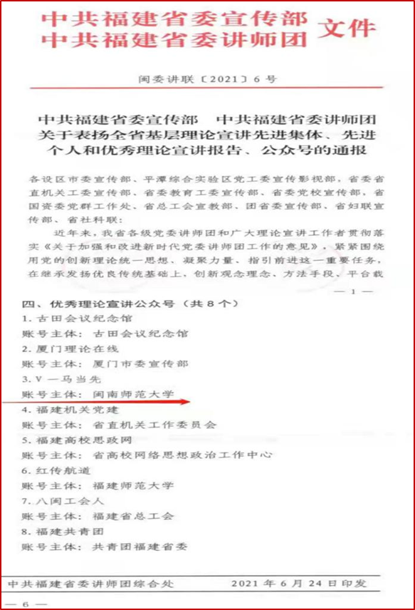 在兰毅辉老师的坚持和努力之下,“V一马当先”公众号进行马克思主义科普宣传已有四个年头了,这四年来共发表推文200余篇,约计57万多字,拥有12807名用户,其科普宣传充分得到了各级领导的肯定。2019年,“V一马当先”公众号获评闽南师范大学十佳微信公众号;2020年,以“V一马当先”为主要平台申请闽南师范大学马克思主义科普基地,获福建省社科联批准立项;2021年,“V一马当先”受到中共福建省委宣传部、中共福建省委讲师团的表彰,获评“优秀理论宣讲公众号”称号。