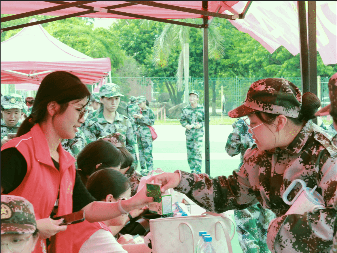 免训的台籍同学黄湘芸和陈羿霏等同学虽未参训,却主动加入后勤志愿队伍,15天风雨无阻递水送药、整理物资直到最后病倒,以细腻的关怀让温暖在彼此心间悄然流淌。旗手梁佳乐始终以挺拔的身姿高擎连旗,任凭汗水浸透衣衫,依旧稳如磐石,成为整个方阵的方向与灵魂。荣获“军训标兵”的罗展鹏,既是队列中严于律己的“排头兵”,也是休息时以精彩武术点燃全场热情的“开心果”。这些动人的点滴,汇聚在一起,编织出军训时光里最温暖而明亮的底色。