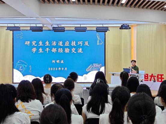 随后,何明波同学则以《研究生生活适应技巧及学生干部经验交流》为题,结合自身经历,从六个方面与全体新生展开交流。一是新环境要主动适应。二是新文件要主动研究。三是新阶段要主动提升。四是新人物要学会接受。五是新关系要学会协调。最后,何明波同学总结本次分享会内容,建议新同学们根据自身情况进行规划研究生阶段的发展目标,寻找到一个积极向上的状态来开启崭新阶段。