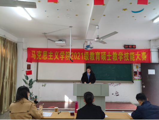 为深入贯彻落实习近平总书记关于教育工作的重要指示精神,适应新形势下的教育教学改革,加强我院学科教学(思政)的教学基本功训练,提升教学技能,展示教师风采,我院于12月19日上午八时在综合楼南区102教室举行了2021级学科教学(思政)研究生教学技能大赛。