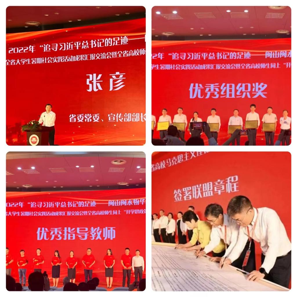会上为本次全省大学生暑期社会实践活动的优秀成果获得者颁奖。我校荣获“优秀组织奖”,我院教师何铭灏荣获“优秀指导教师”称号,黄恩鸿、杨铭分别荣获研究生学术论文组一等奖、三等奖,林培灿、林舒文分别荣获本科生实践心得组二等奖、三等奖。