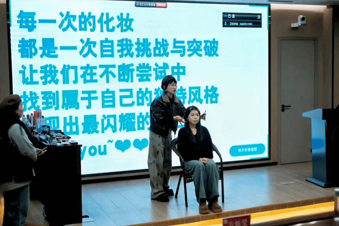讲座中,林夕女士着重强调底妆的重要性,并以此为核心,详细解析了不同肤质的护理要点和底妆适配度。她进一步展示“职场妆容金字塔模型”,从无瑕底妆到唇色选择,分步讲解职场妆容的核心要素,为同学们“解锁”职场妆容的奥秘。