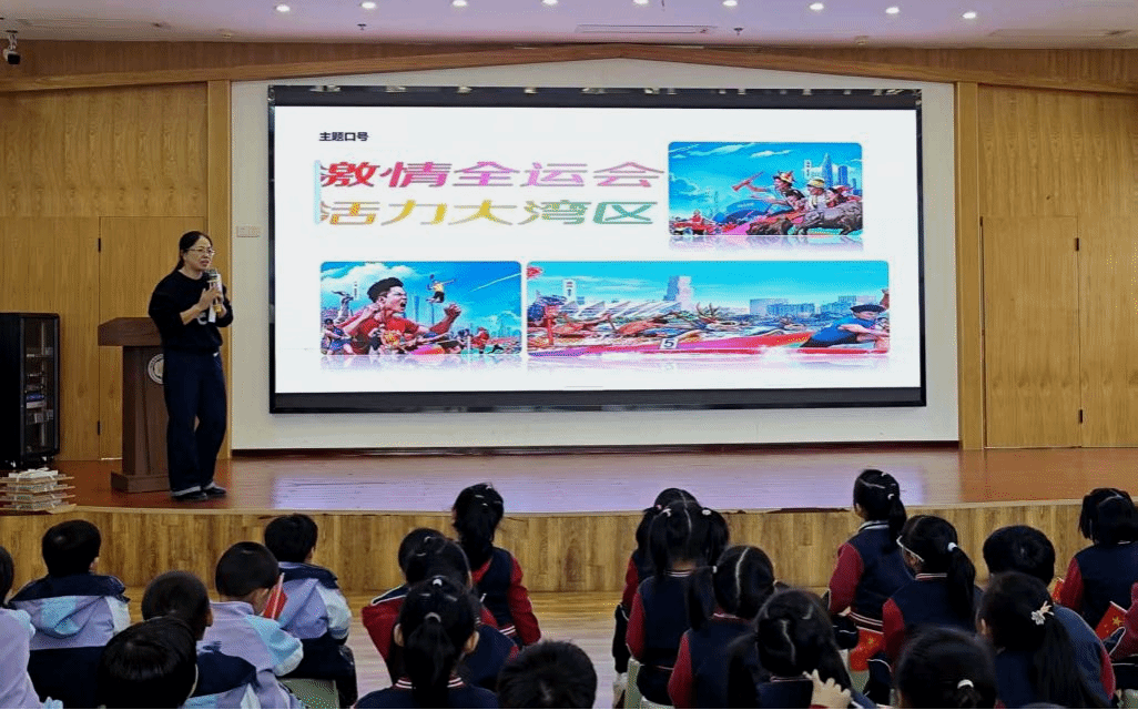 活动伊始,思政小课堂开启。马怡老师以“红心耀全运”为主题,借助色彩鲜明的图片、赛场精彩的视频讲述全运会赛场上的运动故事,从短跑运动员冲刺的矫健身姿,到体操选手舒展的优美动作,一个个鲜活场景让孩子们目不转睛,孩子们在直观感受运动魅力的同时,悄然感知国家强大的体育实力;随后,姚禹老师带来“新时代的伟大科技成就”主题分享,屏幕上遨游太空的卫星、飞驰的高铁等图片瞬间吸引了孩子们的注意力,他将抽象的科技知识转化为幼儿能理解的生动内容,孩子们踊跃回答、积极互动,现场的氛围欢快热烈。