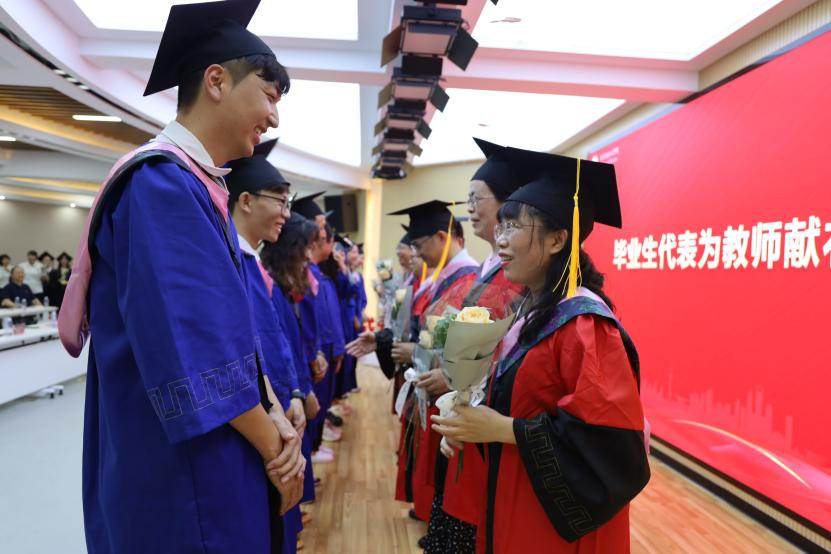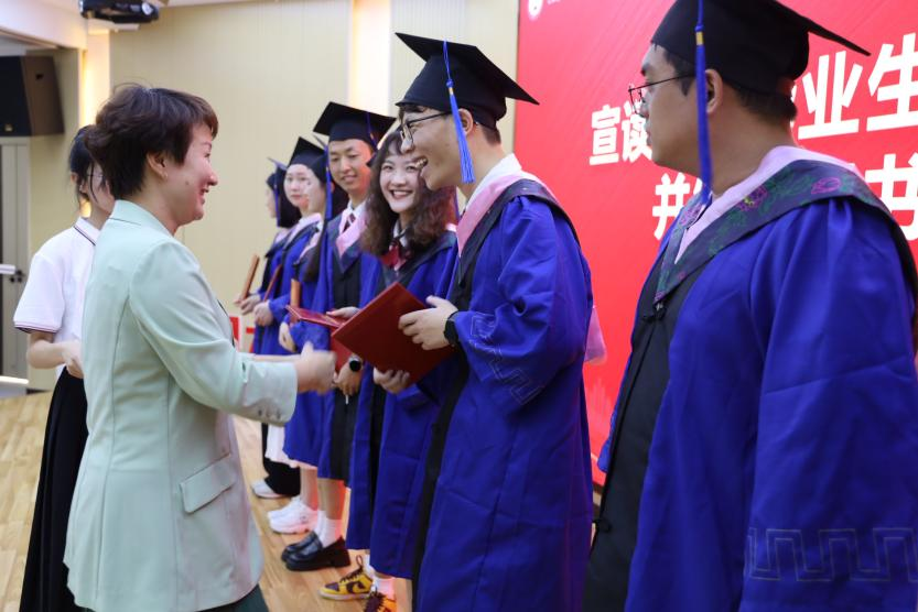 其次,硕士生导师郑育琛副教授作为教师代表发言。她希望在座的各位学子,在未来的工作中,心中有理想、脚下有力量,奋勇争先,接续奋斗,创造无愧于时代的美好人生。