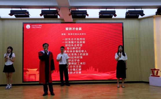随后,陈再生院长致辞。他指出,这几年正是学院大发展、大提高的时期。在马院师生的共同努力下,学院取得了一系列成绩,驶入了发展的快车道,见证了学院成立十周年,学院并以此为起点接续奋斗。全体马院人爱岗敬业、奋发有为,战斗在教书育人的一线,承担着科学研究、社会服务的重任,为福建省重点建设高校、福建省“双一流”建设高校及和谐校园做出了应有贡献。在今年毕业的同学中,有5名研究生成功考博,28名本科生成功考取硕士研究生。这不仅是属于马院的荣誉,更是大家拼搏进取的印记。临别之际,他对同学们提出几点嘱托:一是希望大家目有山川,做一个成长路上志存高远的人;二是希望大家心有明灯,做一个拼搏路上善良温暖的人;三是希望大家胸有丘壑,做一个圆梦路上懂得坚持的人。