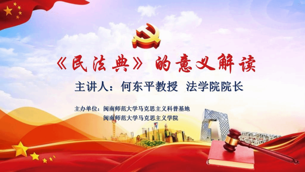 为深入学习贯彻落实党的十九届四中、五中全会精神和中央全面依法治国工作会议精神,进一步增强师生的法治观念,以法治宣传周为契机,开展普法宣传,12月10日晚,我院及校马克思主义科普基地联合主办的《中华人民共和国民法典》普法专题讲座在励志130举行。法学院院长何东平教授应邀做了题为《“民之基,国之远”--<民法典>的意义解读 》的精彩讲座。yl34511线路中心师生及校马克思主义理论读书社学生近200人现场聆听。讲座由我院院长助理何孟飞教授主持。