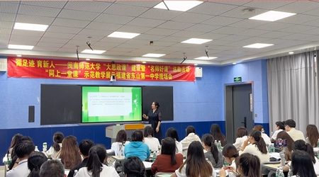 闽南师范大学注重发挥思想政治教育省级一流本科专业优势,创新开展一系列“大手牵小手”育人实践,推动了大中小学思政课的有效融合,实现优势互补。落实教育部“师范教育协同提质计划”,联合湖南、宁夏、江西、福建四省六所高校思想政治教育专业大学生赴东山与中小学生联动研学。深入学校附属小学、幼儿园,向小朋友讲授女排在漳州集训的故事,排演《闪闪的红星》红色主题课本剧。举办“共研一话题”“同上一堂课”“携循一足迹”活动,大中小学思政课教师同台研讨、同堂磨课、同行研习。以纪念谷文昌诞辰110周年为契机,举办“追寻领袖足迹,赓续红色血脉”艺术思政课,闽南师范大学与东山一中共同创作情景剧《丰碑在人间——谷公》,让大学生与中学生同台“共演一台戏”“共唱一首歌”“共跳一支舞”“共诵一首诗”,创新思政课实践教学方式。