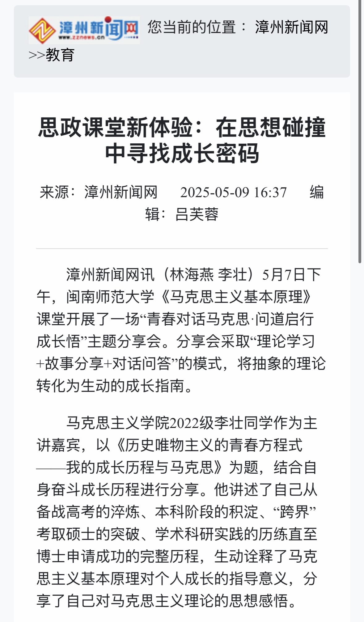 01漳州新闻网:思政课堂新体验:在思想碰撞中寻找成长密码