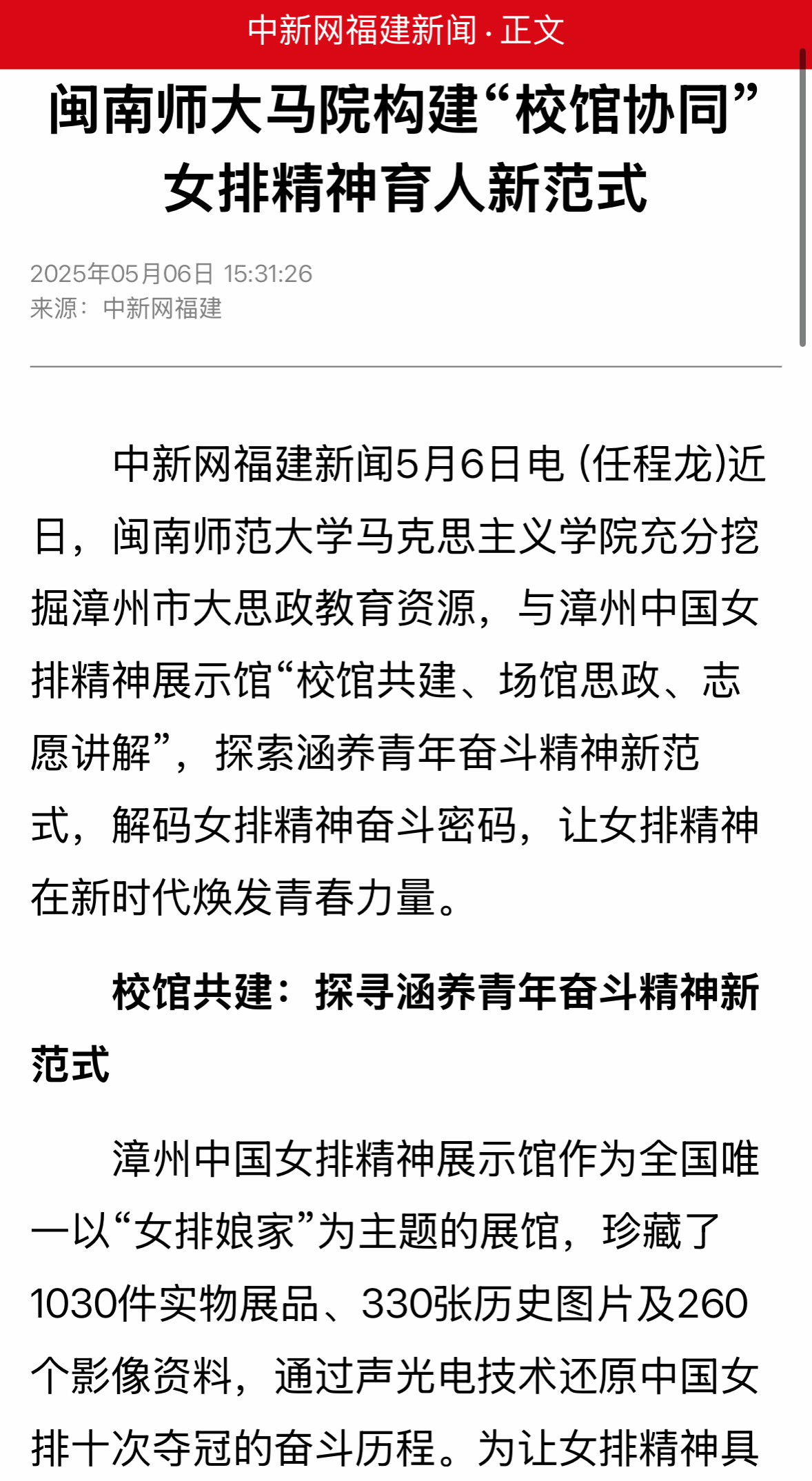 02中新网福建新闻:闽南师大马院构建“校馆协同”女排精神育人新范式