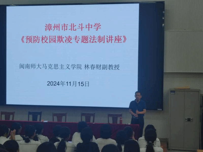 近日,我院林春财副教授受邀前往漳州市北斗中学开展《预防校园欺凌专题法制讲座》。(通讯员 林春财)